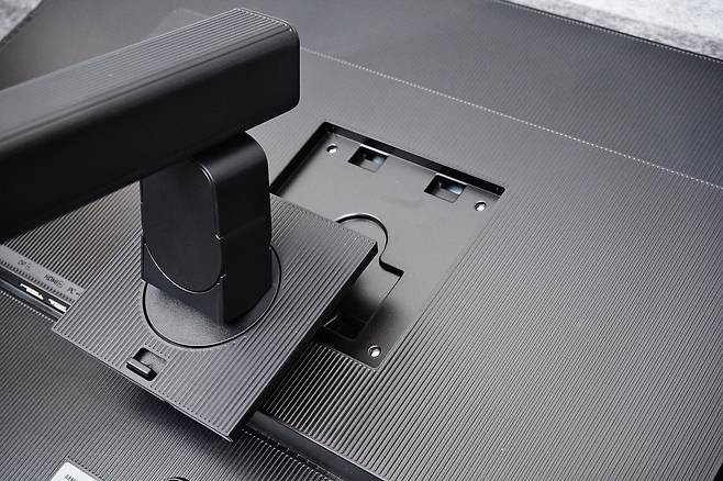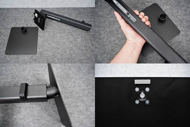 스탠드는 손으로 잡았을 때 내구성이 좋아보였고, 세팅 시 안정적으로 고정되었습니다. 모니터 후면 중앙부에 장착하는 방식이고, 100x100mm 베사홀을 지원해 모니터암 설치도 가능합니다.