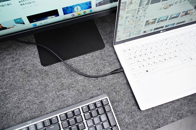 특히 만족스러웠던 기능은 USB-C 포트를 통한 연결성입니다. 저는 맥북은 없고 LG 그램을 사용 중인데, C포트 하나로 전원 공급 최대 90W를 지원해, 데이터 전송, 화면 출력까지 동시에 해결됩니다. 책상 위가 복잡해지지 않고, 어댑터를 따로 챙길 필요 없이 충전이 가능하다는 점은 꽤 큰 장점입니다.