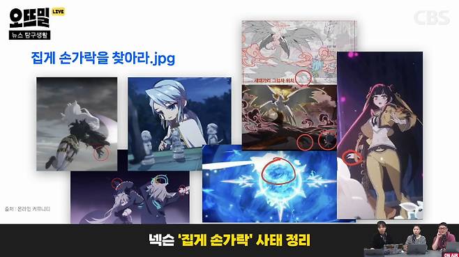 그와 동시에 스튜디오 뿌리가 작업한 수많은 게임 홍보 영상의 캡쳐들이 온라인 커뮤니티에 올라오기 시작해요. 집게손을 했거나 집게손과 유사한 그림자가 있거나 이런 걸 다 동그라미 쳐서 '왜 집게손이냐, 부자연스럽다, 의도가 있다, 은근슬쩍 스리슬쩍 넣었다'는 얘기가 나왔고요. 하청업체인 뿌리가 원청업체인 넥슨에 납품하는 콘텐츠에 개인적인 사상을 넣었다는 주장이 나옵니다.