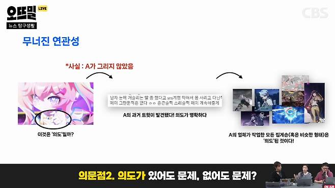 ◆ 신혜림> 처음 의혹이 제기되고 각종 캡쳐가 올라오면서 스튜디오 뿌리가 일부러 이랬다는 식의 주장이 나오는 것까지, 8시간 동안 벌어진 일입니다. 스튜디오 뿌리도 해가 뜬 뒤 사과문을 올리고, 그 다음날 또 올려서 두 번의 사과를 했는데요. 두 번째 사과문에서는 '문제의 스탭이 퇴사 결정했다'고 하면서 이 사건이 끝나는가 싶었어요. 그런데 며칠 뒤 상황이 반전됩니다. 경향신문에 단독 기사가 나온 거예요. 알고 보니 해당 집게손가락 포즈를 그린 건 지금 문제라고 지목당한 여성 애니메이터도 아니고 다른 여성도 아니고 40대 남성인 거죠.