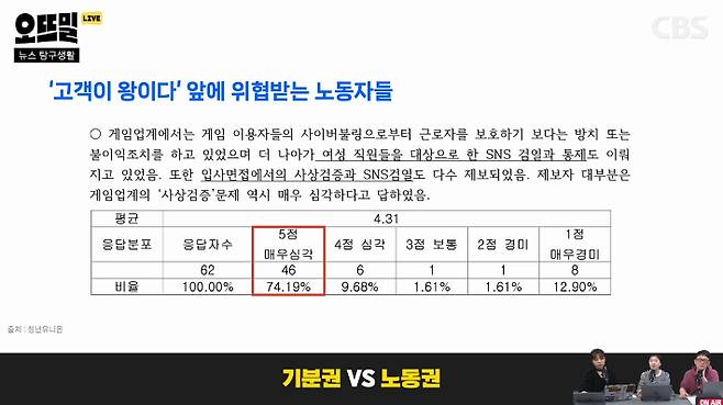 ◆ 신혜림> 그런 실질적인 위협을 크게 입는 사람들이 점점 더 늘어나고 있잖아요. 얼마 전에 진행된 게임업계 여성 직원 대상 설문조사가 있어요. '사상 검증 문제가 얼마나 심각하냐'고 물으니 '매우 심각하다'가 74.19% 나왔어요. 매우가 이렇게 높은 건 사실 되게 이례적이잖아요. 입사 면접에서도 사상 검증한다는 제보가 많이 들어왔다고 해요. 그동안 이 문제를 신경써왔던 언론사가 몇 개 있는데, 전반적으로는 이 문제에 사실 크게 신경 쓰지 않았거든요. 이제야 공론화가 되고 있어서 신경을 많이 써야될 거 같아요. 노동청에서 지금 12월에 넥슨이랑 넷마블 같이 서울 소재 게임업체에 노동자 보호조치 특별 점검 들어갔다고 하거든요. 이 결과도 주의 깊게 한번 봐야 될 것 같습니다.