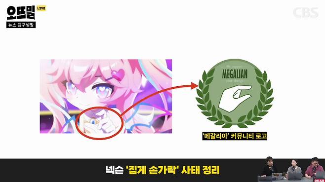 ◆ 신혜림> 이런 생각을 해봤어요. 만약에 진짜 의도를 가지고 공동 작업물에 다른 작업자도 모르게 손을 댄 게 확실하게 밝혀졌다면 문제일 텐데, 이 포즈는 의도를 밝히기도 정말 힘들다는 게 중론이에요. 게임전문 언론인 디스 이즈 게임을 비롯해 여러 매체에서 애니메이션 현업자들한테 물어봤는데요. 애니메이션은 말 그대로 동화, 움직이는 그림이기 때문에 방점이 스틸 컷 하나하나가 아니라 움직임에 있어요. 그래서 엄지와 검지가 다른 손가락보다 좀 굽혀져 있는 모양은 인체 구조상 손을 움직이는 과정에서 나올 수밖에 없다는 수밖에 없는 거죠. 아마 메갈리아 이전에 나온 애니메이션을 프레임 단위로 뜯어보면 그 손가락 포즈가 꽤 나올 거예요.
