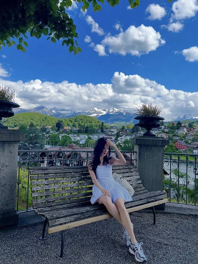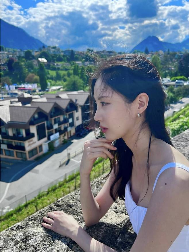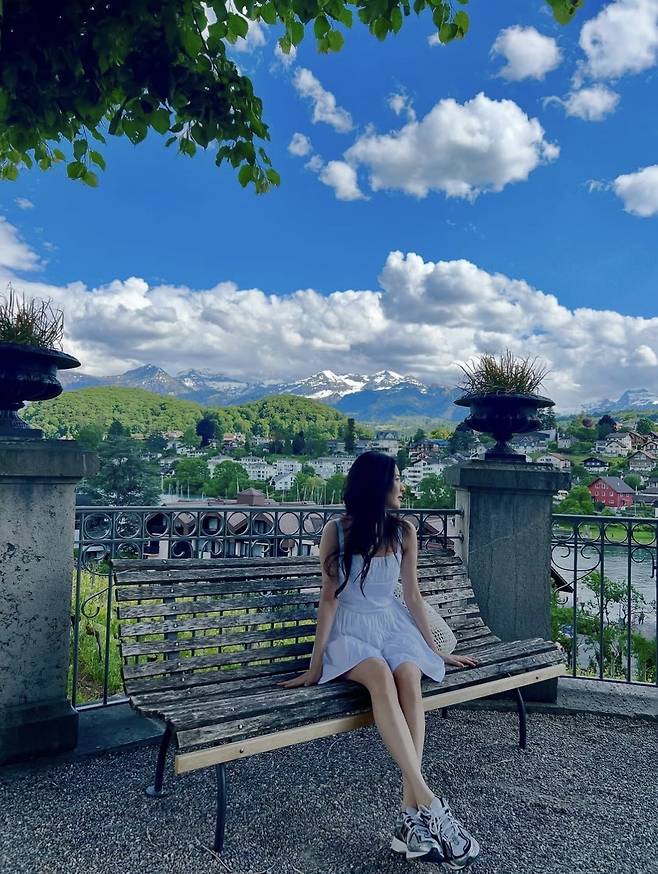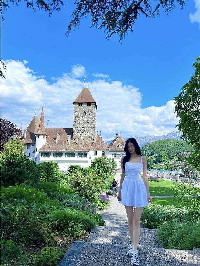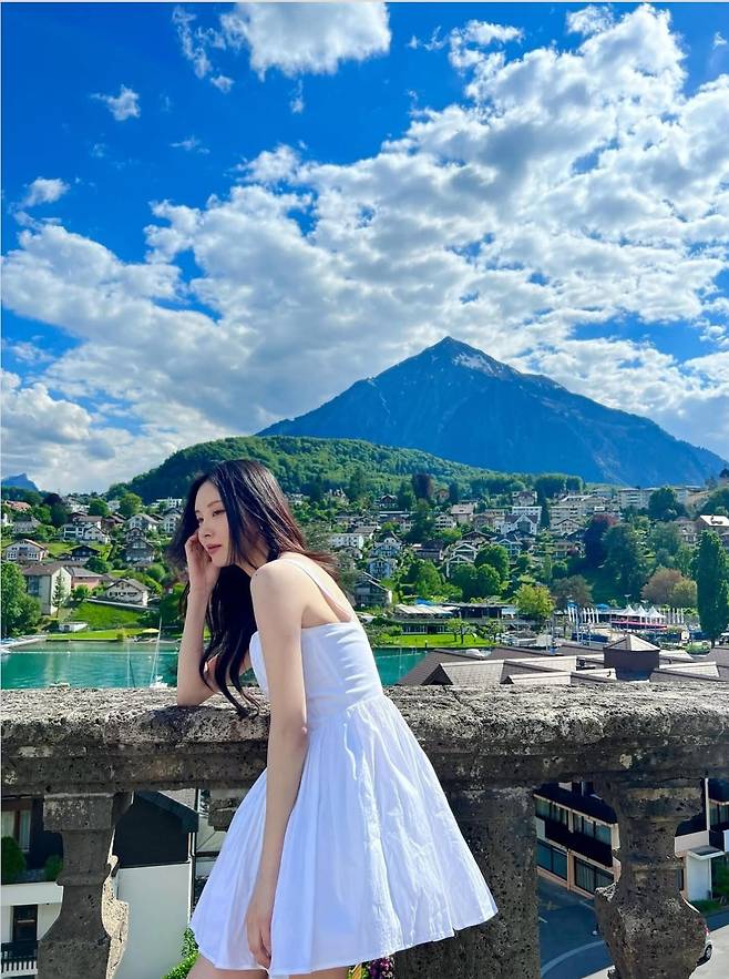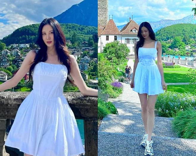 서현은 탁 트인 하늘과 고성, 푸른 정원이 어우러진 스위스에서 단아한 화이트 미니 원피스를 입고 눈부신 미모를 미모를 자랑했습니다.
