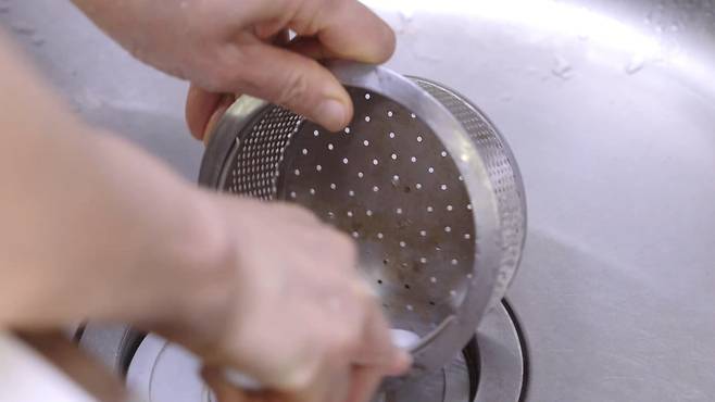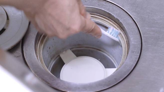 배수구 망에 있는 음식물 쓰레기를 비운 후, 내부를 깨끗이 청소해 주세요. 이때 못쓰는 칫솔에 치약을 묻혀 닦으면 보다 깨끗하게 닦을 수 있답니다.
