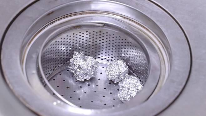 이제 깨끗이 씻은 주방 배수구에 만들어 놓은 호일볼을 넣고 사용하면 끝이에요.