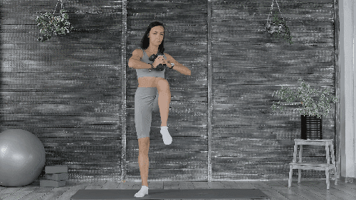 다리를 충분히 벌리고 바닥에 서서 준비합니다. 손은 가슴 앞으로 모으고, 아령이나 생수병을 잡습니다. 스쿼트 동작을 수행합니다. 일어나는 동시에 한쪽 무릎을 가슴 방향으로 당기면서 상체를 반대 방향으로 틀어줍니다. 다시 스쿼트 자세로 돌아간 후, 반대편 무릎을 당기면서 상체를 틀어줍니다.