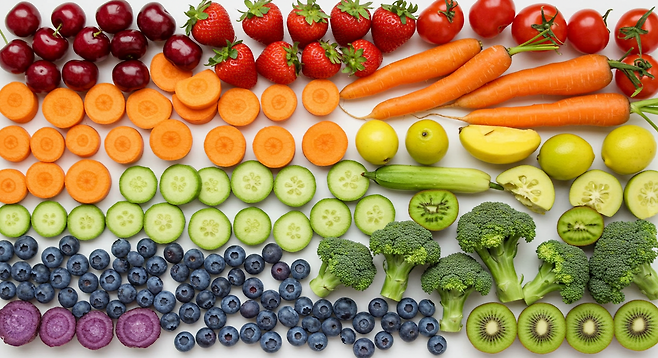 딸기, 블루베리, 포도, 호박, 토마토, 피망, 오렌지, 브로콜리, 당근 등 다양한 색깔의 과일과 채소들은 플라보노이드와 카로테노이드 같은 항산화 성분이 풍부합니다. 이들 성분은 관절염으로 인한 통증과 염증을 효과적으로 줄여줍니다.