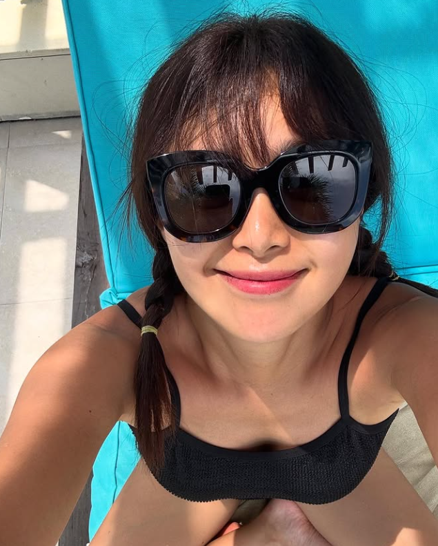 여기에 더해진 아이템은 바로 와이드 한 프레임의 선글라스였어요. 이영은 님은 블랙 프레임의 오버사이즈 선글라스를 선택해서 전체적인 룩에 힘을 실어줬는데요. 선글라스 하나만으로도 리조트 분위기가 물씬 느껴졌죠.