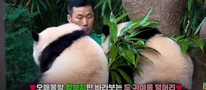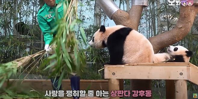 최근 루이와 후이는 성장하면서 대나무 등 일반적인 식사를 하는 연습을 하고 있습니다. '전량섭취걸' 엄마를 닮은 만큼 두 친구 모두 식탐이 많아 대나무 줄기를 주면 늘 집중해서 먹곤 했는데요. 하지만 이날 두 친구는 그렇게 좋아하던 대나무 줄기에 그다지 관심을 보이지 않고, 오로지 할부지 강 주키퍼만 응시하며 사랑의 눈빛을 보내고 있었습니다.