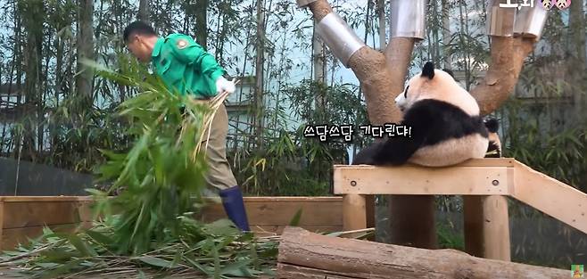 하지만 강철원 주키퍼는 대나무들을 정리하느라 쉴 틈이 없어보였죠. 판다들이 먹을 대나무들을 손질하는 중이었기 때문입니다.