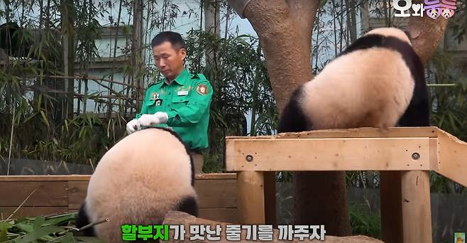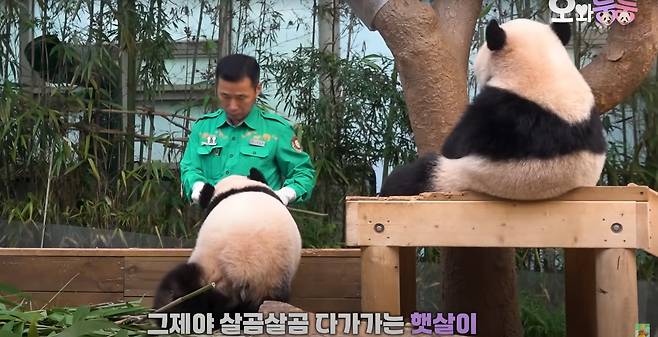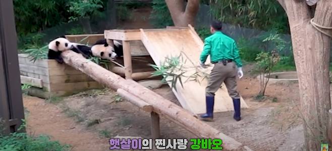 그러나 속으로 조금은 미안했는지 강철원 주키퍼는 두 곰돌이가 다가오자 먹기 좋게 손질한 대나무 줄기를 루이후이에게 주었습니다.