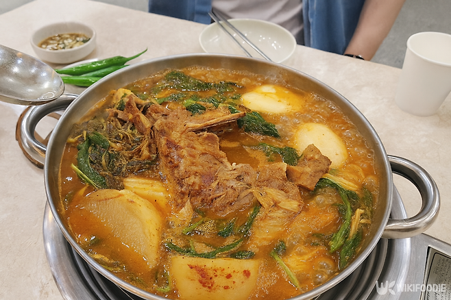 이 집의 가장 큰 특징은 ‘푸짐함’이다. 큼지막한 뼈에 붙은 살코기가 듬뿍 담기고, 국물은 진하면서도 깔끔하다. 우거지와 깻잎이 넉넉하게 들어가는데, 특히 어린 깻잎을 사용해 향은 부드럽고 질감이 신선하다. 잡내 없이 깔끔하게 삶아낸 고기는 젓가락으로도 쉽게 떨어질 만큼 부드럽다.