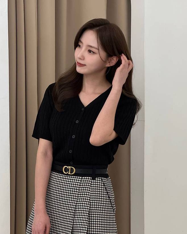 #스타패션 #조명진패션 #하객룩 #출근룩 #데이트룩 #블랙가디건 #하운드투스스커트 #클라비스 #CD벨트 #여름코디 #클래식룩 #모던패션