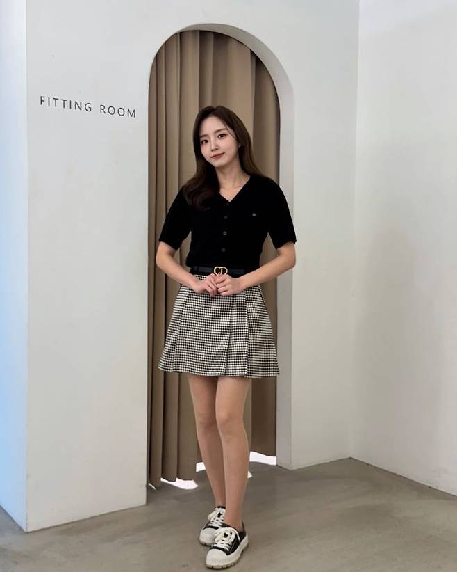 하의로는 클래식한 하운드투스 체크 패턴의 플리츠 스커트를 선택해 상의의 단조로움을 경쾌하게 풀어냈다. 블랙 앤 화이트 컬러 조합은 계절을 타지 않는 모던룩의 정석이자, 어떤 자리에서도 튀지 않으면서도 존재감을 뚜렷이 드러낼 수 있는 조합이다. 여기에 골드 버클의 CD 로고 벨트를 더해 고급스러운 포인트를 주었다. 허리선의 강조를 통해 전체 실루엣을 정돈해주면서도 룩에 중심을 잡아주는 역할을 톡톡히 한다.