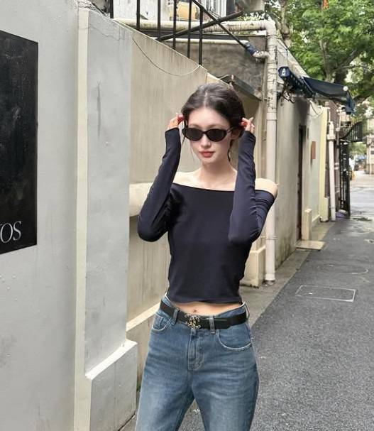 슬림한 핏의 오프숄더 상의가 눈에 띄어요. 직각 어깨의 장점을 부각해 주네요.
