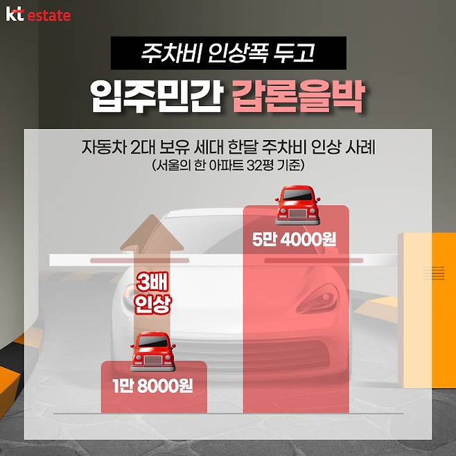 해당 아파트는 입주자대표회의에서 자동차를 2대 보유한 가구의 주차비를 32평 기준으로 환산했을 때 기존 1만8000원에서 5만4000원으로 무려 3배나 올리며 문제가 불거진 것인데요. 여기에 보유 대수별로 누진율을 택해 차량을 3대 보유하면 기존 주차비의 7배, 4대 보유 시 8배 이상 상승하는 구조가 논란이 됐습니다.