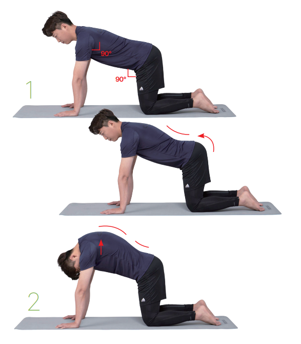 두 손으로 바닥을 밀어 등이 넓게 펼쳐지는 느낌을 만든 뒤 고개를 숙이며 등 가운데를 천장을 향해 들어 올립니다.