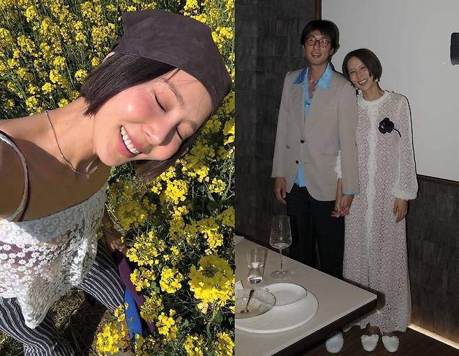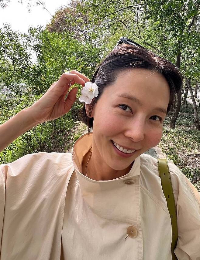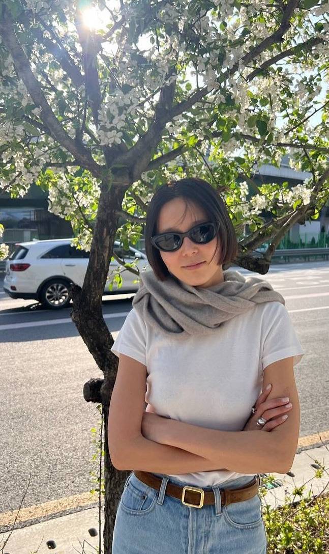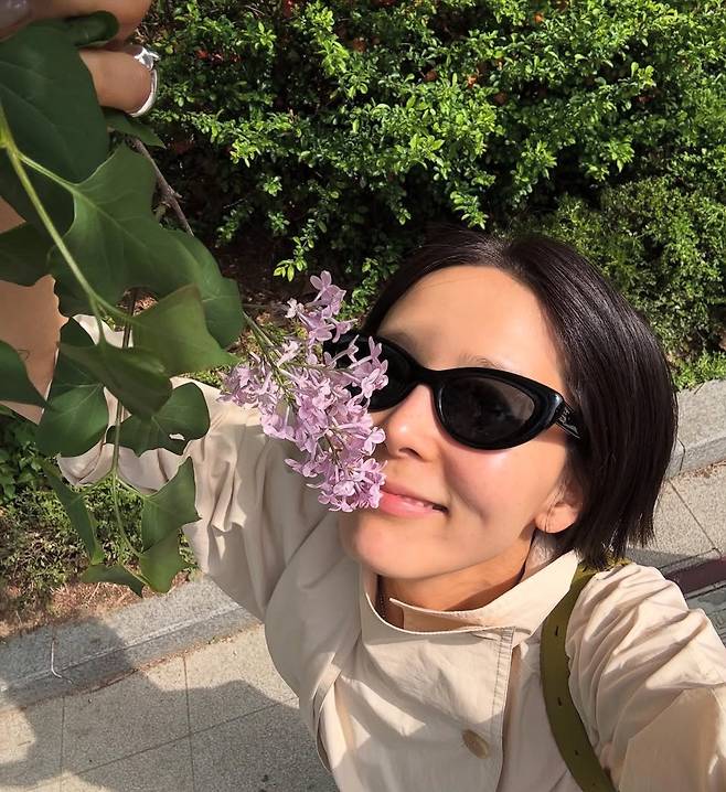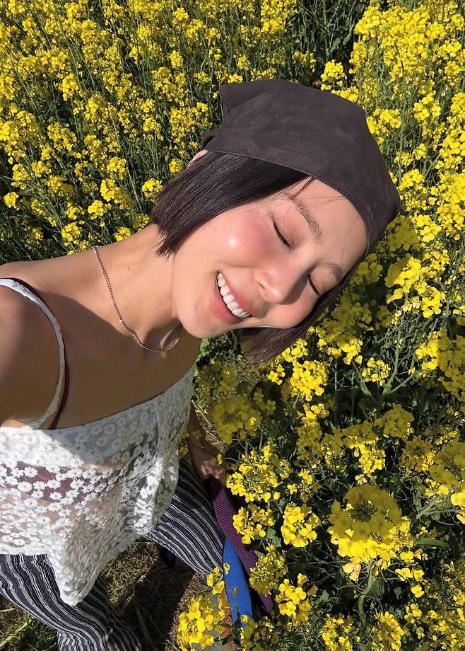 머리에는 다크 브라운 스카프를 두르고, 햇살 아래 눈을 감은 채 미소 지은 모습이 자연 속에서의 여유로움을 더욱 돋보이게 했습니다.