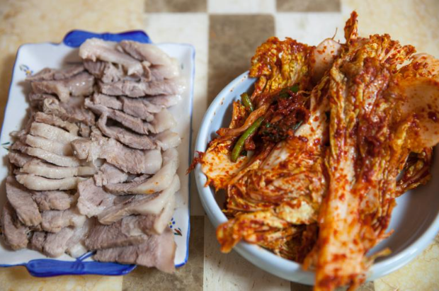 ▶ 갓 담근 김장김치를 손으로 길게 찢어 따끈한 수육에 올리세요.