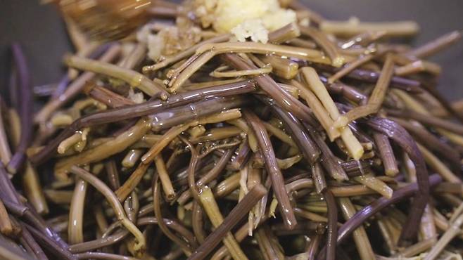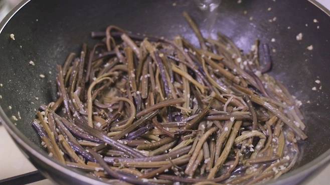 손질이 완료된 고사리는 조리하기 전 웍팬에 놓으세요. 그리고 참치액젓, 국간장, 들기름, 마늘을 함께 넣은 후 조물조물 무쳐 주세요. 이대로 5분 정도 두어 간이 배도록 하면 된답니다.