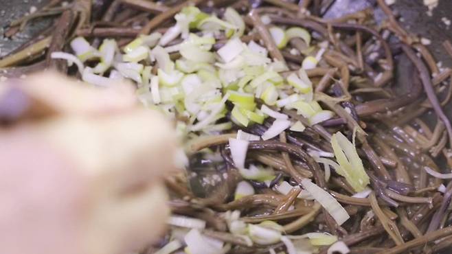 3~4분이 지나면, 파 & 청주를 넣고 '강불'에서 재빨리 볶아 주세요. 청주를 넣고 볶으면 고사리 특유의 비린맛이 날아가 맛있게 먹을 수 있습니다.