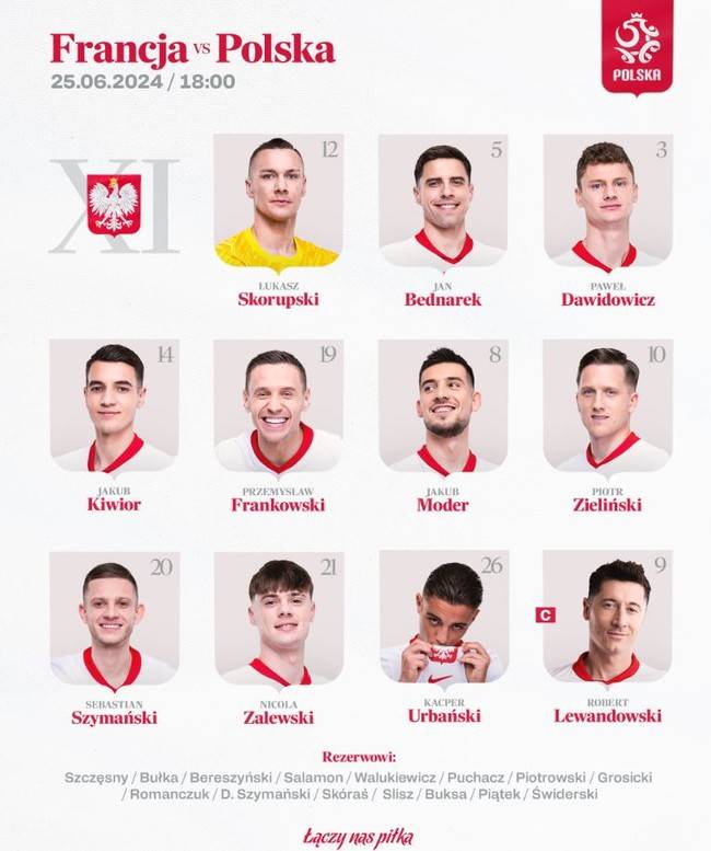 이에 맞서는 폴란드는 레반도프스키, 시만스키, 잘레프스키, 모데르, 우르반스키, 지엘린스키, 프란코프스키, 키비오르, 다비도비츠, 베드나레크, 스코룹스키가 선발 출장한다.