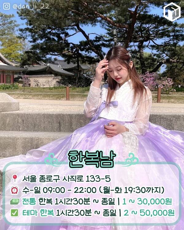 전통 한복은 단아하고 수수한 스타일의 한복을 의미합니다. 테마한복은 색감과 무늬가 화려한 스타일로 퓨전 한복과 캐릭터 한복이 포함되어 더욱 선택지가 다양합니다. 한복을 착용한 뒤 갈래머리, 반묶음 또는 올림머리 중 하나를 골라 스타일링을 할 수 있습니다.SNS 이벤트 참여시 정가 5만원의 종일 이용권을 2만원에 이용 가능하기도 하니 참고하시면 되겠습니다.