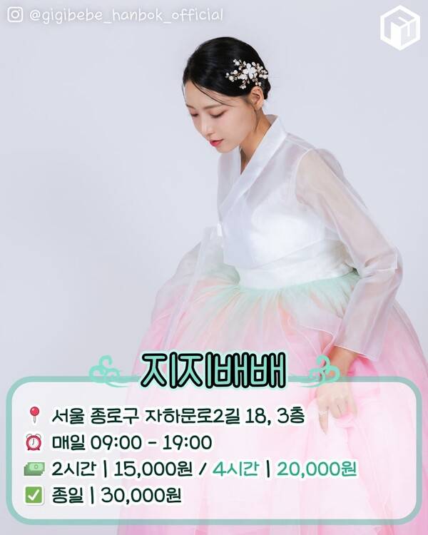 종류 뿐 아니라 이용 시간에 따라 가격이 모두 상이합니다. 최근 가장 인기많은 한복은 갈래치마로 파스텔 톤의 치마가 여러 겹으로 나뉘어 살랑이는 치마가 조선시대에서 환생한 여신같은 분위기를 완성해주니 고려해보세요!