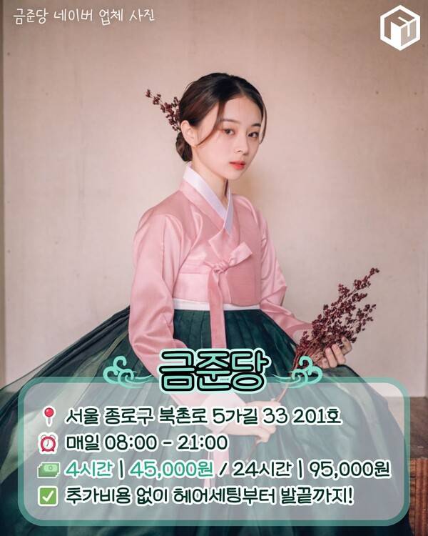경복궁 건춘문과 도보 10분 거리에 위치해있는 경복궁 한복대여 금준당입니다. 전통한복 착용과 헤어 세팅까지 하나의 패키지로 운영되고 있는데요. 한복, 가슴띠, 속바지, 속치마, 버선, 꽃신, 헤어세팅, 악세사리가 포함되어 있어 보다 완벽한 한복 대여가 가능합니다.