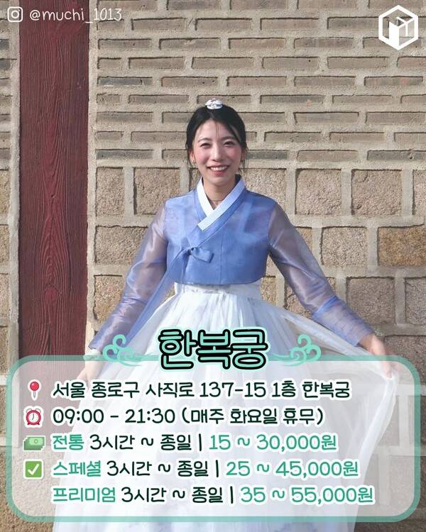 전통 한복은 단아하고 수수한 스타일의 한복을 의미합니다. 테마한복은 색감과 무늬가 화려한 스타일로 퓨전 한복과 캐릭터 한복이 포함되어 더욱 선택지가 다양합니다. 한복을 착용한 뒤 갈래머리, 반묶음 또는 올림머리 중 하나를 골라 스타일링을 할 수 있습니다.SNS 이벤트 참여시 정가 5만원의 종일 이용권을 2만원에 이용 가능하기도 하니 참고하시면 되겠습니다.