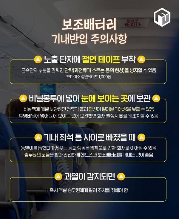 에어부산은 별도의 리튬배터리 휴대품을 점검하고, '노 배터리 인사이드(No Battery Inside)' 별도 표식이 부착된 수하물만 기내 선반에 보관할 수 있는 규정을 도입했습니다. 승객들은 탑승구에서 보조배터리를 가방에서 꺼내 손에 쥐고 탑승해야 하니, 비행기 탑승 전 보조배터리를 꺼내두시길 바랍니다.