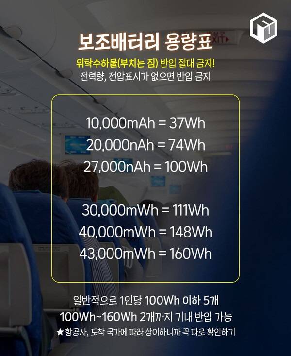 ✅ 100Wh 이하는 5개, 100Wh~160Wh는 2개까지 기내 반입 가능