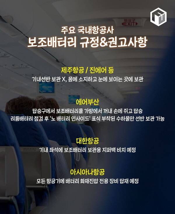 에어부산은 별도의 리튬배터리 휴대품을 점검하고, '노 배터리 인사이드(No Battery Inside)' 별도 표식이 부착된 수하물만 기내 선반에 보관할 수 있는 규정을 도입했습니다. 승객들은 탑승구에서 보조배터리를 가방에서 꺼내 손에 쥐고 탑승해야 하니, 비행기 탑승 전 보조배터리를 꺼내두시길 바랍니다.