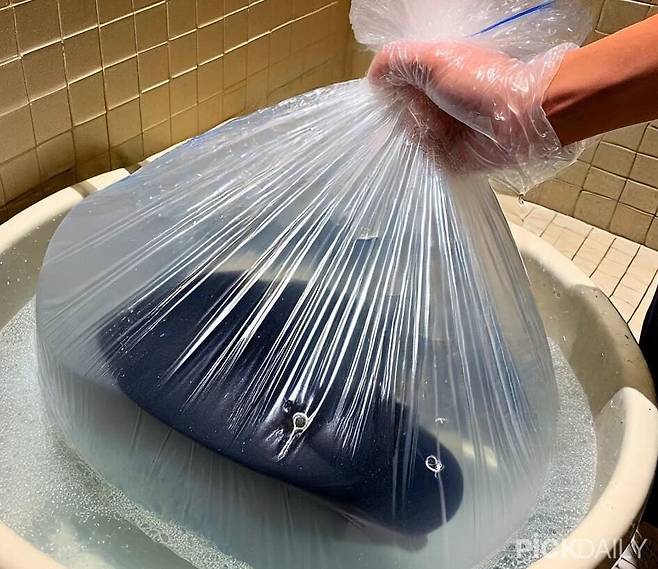 적당한 비닐봉투가 없다면 튼튼하고 커다란 김장봉투를 이용해도 된다. 먼저 욕실화가 충분히 잠길만한 비닐봉투를 준비해 따뜻한 물을 채워준다. 비닐 봉투가 흐물흐물해 형태 유지가 어렵다면 밑에 바가지나 세숫대야를 깔아 놓고 진행하면 좋다.