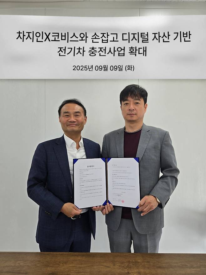 차지인은 지난 9일 최영석 대표와 김태우 코비스 전무이사가 참석한 가운데 디지털 자산 기반 충전 서비스 확대를 위한 업무협약을 체결했다고 11일 밝혔다. 코비스는 전국 중소 충전사업자들이 모여 결성한 협동조합으로, 회원사 간 공동 구매·운영 지원을 통해 충전 인프라 확산을 뒷받침해 온 조직이다.