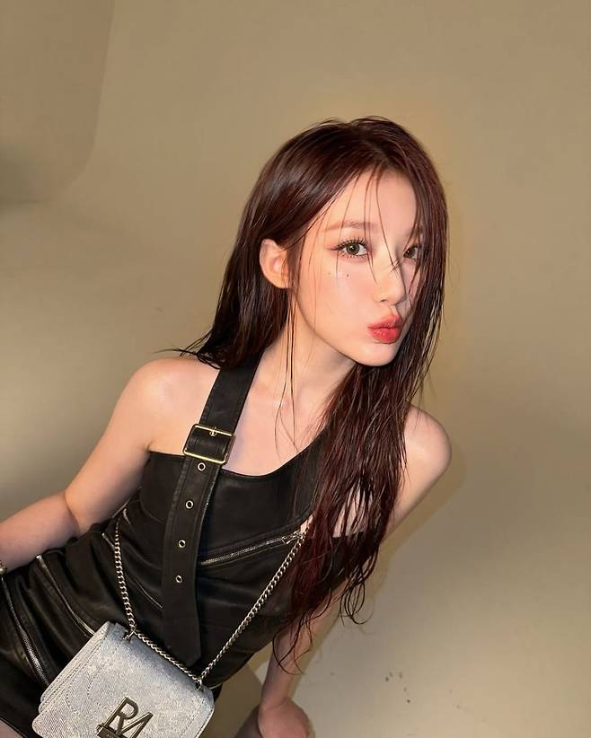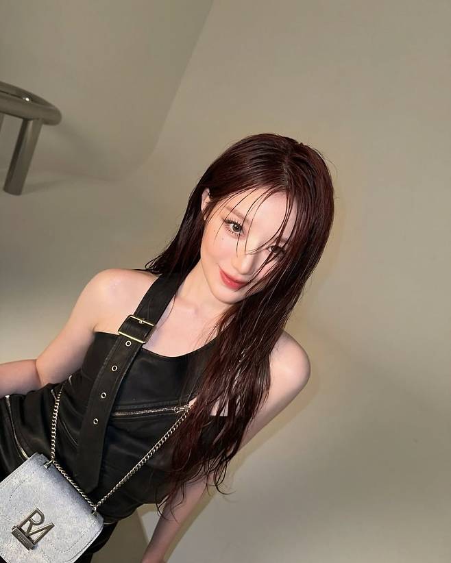 반짝이는 조명이 부드럽게 스며든 공간, 차가운 가죽 의자에 앉은 그녀의 모습은 마치 영화 속 한 장면 같다. 시크한 블랙 레더 원피스에 촉촉한 웻 헤어, 그리고 어깨에 툭 걸친 미니멀한 크로스백.
