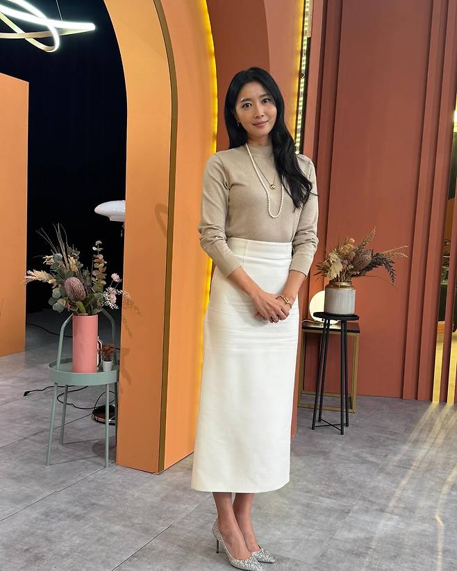 베이지 컬러의 터틀넥 니트와 화이트 롱스커트로 우아한 분위기를 자아냈다. 진주 목걸이와 실버 글리터 힐로 포인트를 주어 고급스러운 분위기를 연출했으며, 블랙 헤어가 세련미를 더했다.