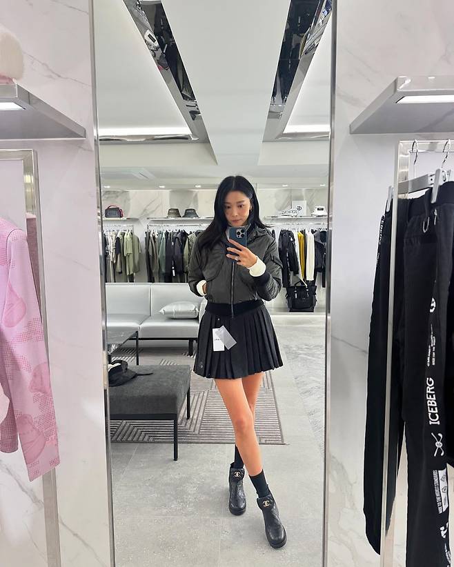 그레이 컬러의 숏 패딩과 블랙 플리츠 스커트로 트렌디한 스쿨룩을 연출했다. 샤넬 로고가 돋보이는 앵클부츠와 블랙 삭스를 매치해 고급스러운 스트리트 무드를 자아냈다.