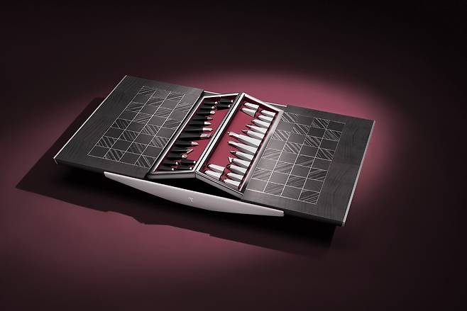 넉넉한 크기의 체스판과 말 수납함의 테두리는 고광택 알루미늄으로 마감됐고, 체스 세트의 전면과 후면에는 브랜드를 상징하는 '환희의 여신상' 문양이 새겨졌다.