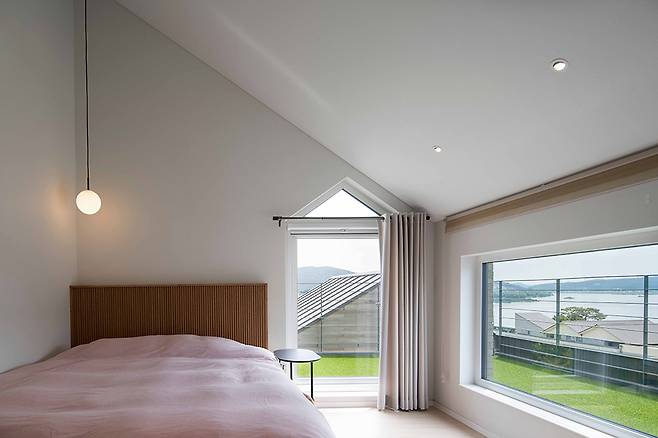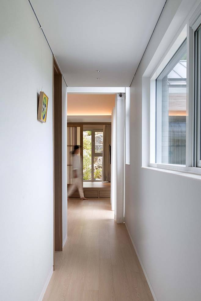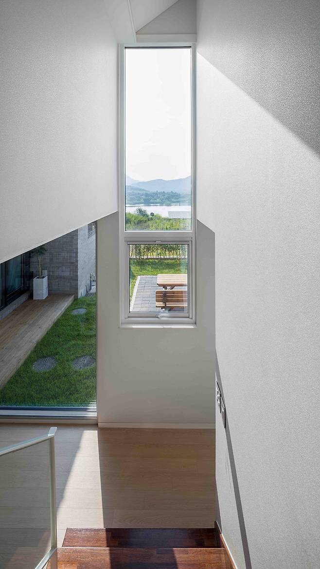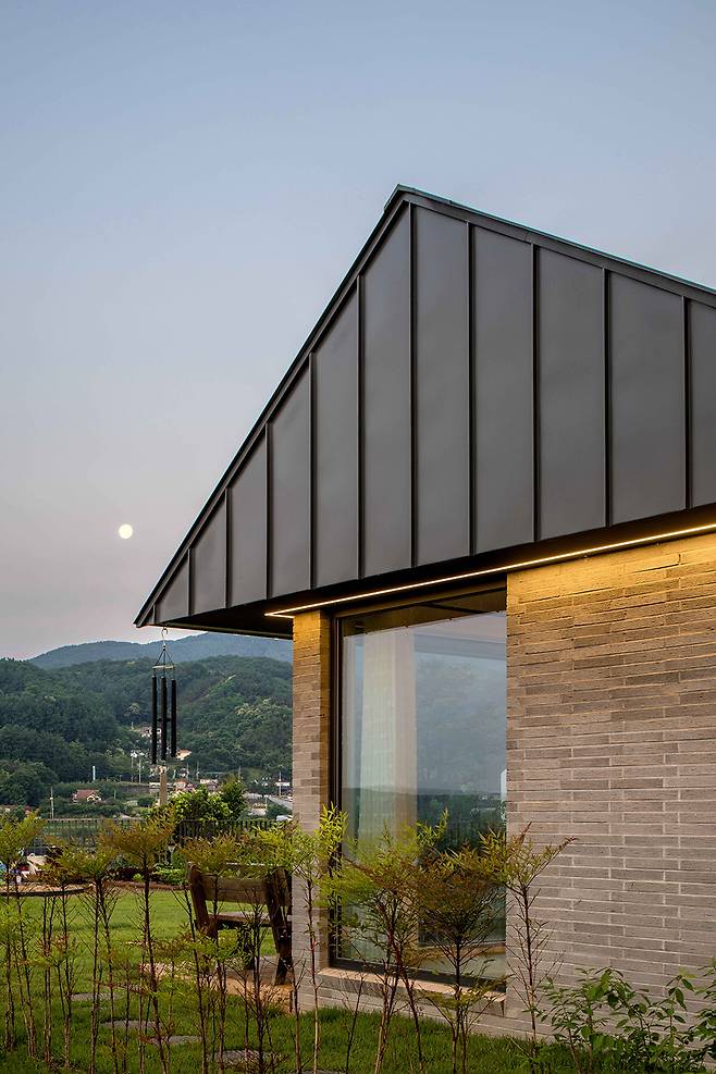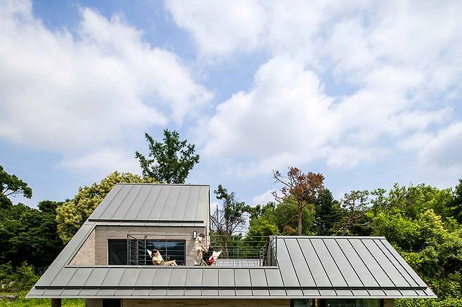 ‘ㄷ’ 형태를 따라 형성된 세 개의 지붕은 쓰임과 의도에 따라 각기 다른 공간감을 부여한다. 깊게 드리운 짙은 색의 처마는 다이닝룸에 무게감을 주고 처마로 둘러싸인 창은 자연의 모습을 담는 프레임이 되어 고즈넉하고 차분한 분위기를 자아낸다. 이러한 지붕의 무게감과 반대로 실내는 밝고 높은 천장 덕에 밖의 풍경을 입체적으로 끌어들여 공간에 몰입감을 더한다. 안방과 서재의 낮은 층고를 보완해주는 완만한 지붕은 경사를 드러내 답답하지 않은 안정감과 아늑함을 준다. 2층 역시 가파르고 높은 층고를 드러내는 지붕이 탁 트인 개방감을 선사한다.