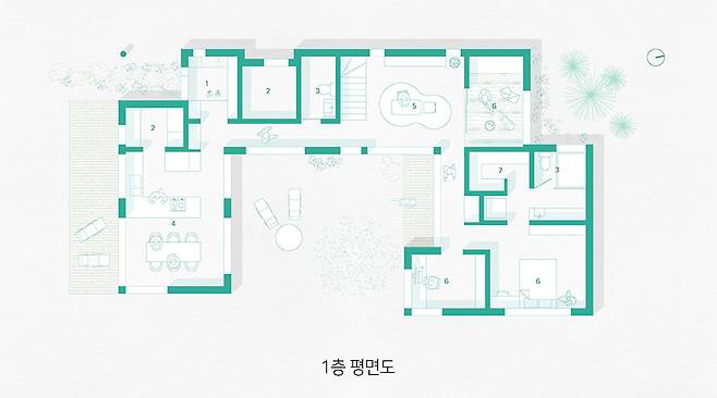 동서방향 자연 축을 고려하며, 안락한 마당을 원했던 건축주의 요구사항에 맞춰 건축가는 서로 다른 두 개의 마당이 있는 'ㄷ'자 형태로 집을 배치했다.