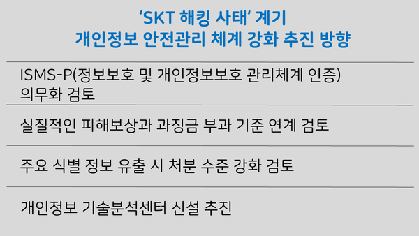 개인정보보호위원회가 SK텔레콤(SKT) 유심(USIM) 해킹 사태를 계기로 ISMS-P(정보보호 및 개인정보보호 관리체계 인증) 의무화를 검토한다. 또 실질적인 피해 회복과 과징금 감면 연계, 단말기 고유식별변호(IMEI)와 같은 주요 식별정보 유출 시 강도 높은 처분 기준 마련 등 안전관리 체계 강화 방안을 논의한다.