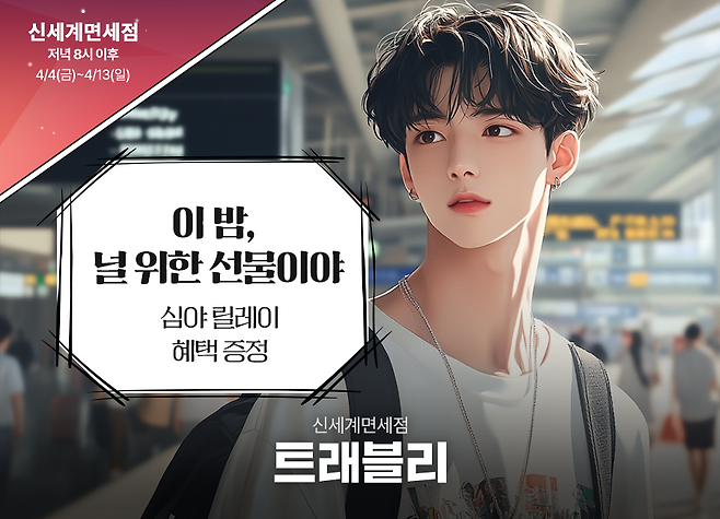 해외여행의 설렘을 배가시켜주는 즐거움. 바로 면세 쇼핑이겠죠. 신세계면세점 앱에서는 심야 쇼핑족을 위한 특별 혜택이 가득합니다. 매일 오후 8시 마다 심야 릴레이 특가를 오픈하고, 심야 전용 쿠폰도 기다리고 있습니다. 랜더스 쇼핑페스타 기간 동안 밤비행기로 떠나신다면 오프라인 혜택도 놓치지 마세요. 신세계면세점 인천공항점에서는 오후 8시부터 9시 30분까지 면세품을 구매한 모든 고객에게 당일 사용 가능한 면세포인트 5천원을 증정합니다.