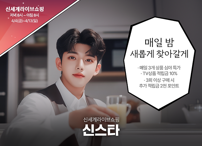 이 밤, 그냥 보내긴 아쉽다면 라이브쇼핑 앱을 켜세요! 가장 똑똑한 쇼핑이 시작될 거예요. 신세계라이브쇼핑은 매일 저녁 8시부터 다음 날 아침 8시까지 랜쇼페 심야 타임 특가를 진행합니다. 매일 3개씩 공개되는 특가 상품은 물론, 10% 적립금, 행사 기간 동안 3번 이상 구매하면 추가적으로 드리는 2천 포인트까지! 미리 예고된 아이템만 해도 썬키스트 오렌지 반값 할인, 한우 모둠 구이 2만원 대, 조성아 클렌저가 1만원 대… 이 정도면 그냥 잠들 순 없죠.