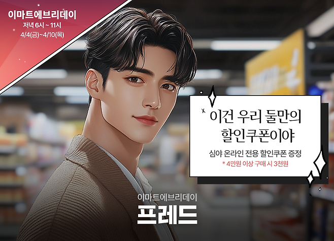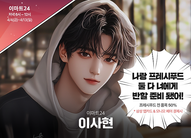 덥지도 춥지도 않은 지금. 밤공기 쐬며 산책하다보면 편의점 불빛이 유난히 반가워집니다. 밤마실 중에, 귀가 길에, 혹은 그냥 야식이 간절한 그 밤. 이마트24에 꼭 들러보세요. 이마트24는 오후 6시부터 자정 사이에 도시락, 김밥, 햄버거 등 프레시푸드 전 품목을 반값*에 판매합니다. 여기서 하나 더, 오후 6시마다 이마트24 앱에 접속해 선착순으로 드리는 할인 쿠폰도 꼭 쟁취하시길!