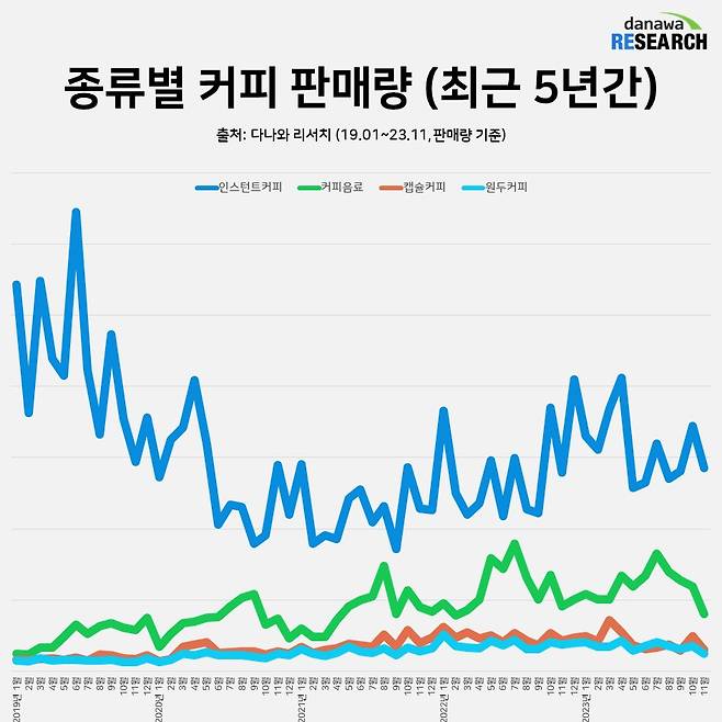2019년 1월부터 2023년 10월까지 5년간 종류별 커피 판매량을 살펴보면 한국인의 인스턴트 커피 사랑이 어느 정도인지 짐작할 수 있다. 인스턴트 커피 판매량은 2019년부터 부동의 1위를 차지하고 있으며, 코로나19로 타격을 받은 이후에도 꾸준히 판매량을 늘려가며 커피 시장에서 절대적인 우위를 차지하고 있다.