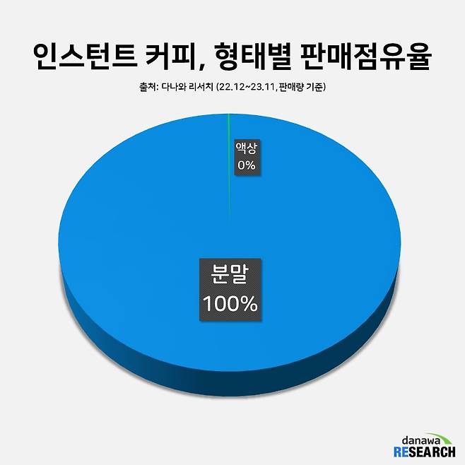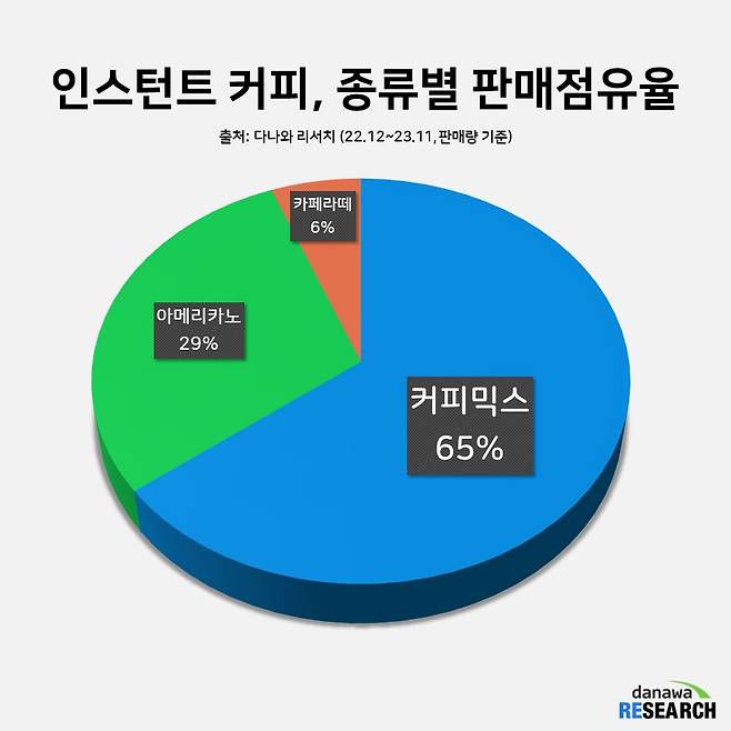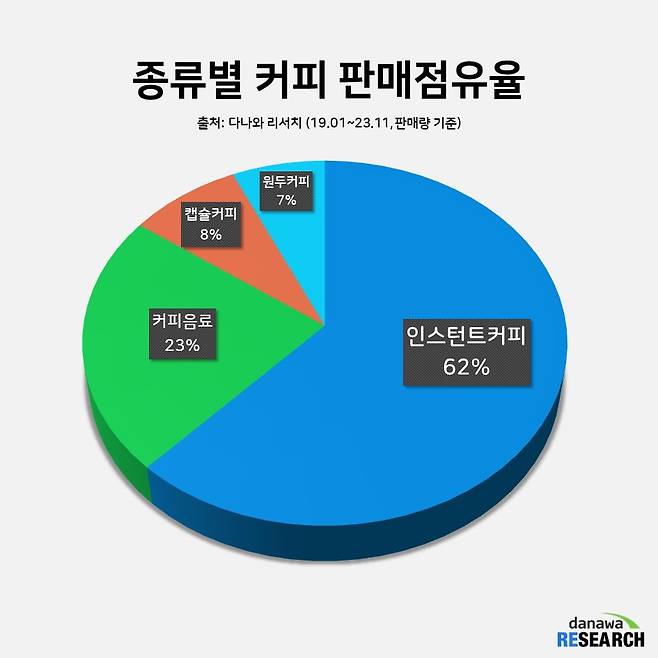 2022년 12월부터 2023년 11월까지, 최근 1년간 종류별 커피 시장에서 인스턴트 커피의 판매 점유율은 62%. 커피음료, 캡슐커피, 원두커피 판매 점유율을 모두 더해도 인스턴트 커피보다 적다. 2위에 오른 커피음료는 23% 점유율을 차지했고, 캡슐커피와 원두커피는 각각 8%, 7%를 차지했다.