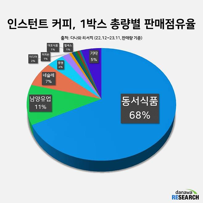 그렇다면 2023년 한 해 동안 가장 많은 사랑을 받은 인스턴트 커피 브랜드는 어디일까? ‘커피믹스’하면 모두가 첫 번째로 손꼽을 만한 그 브랜드는 바로 ‘맥심’의 동서식품이다. 무려 68% 점유율을 차지한 동서식품은 맥심, 맥심 카누 등 커피 종류를 막론하고 큰 인기를 얻으며 인스턴트 커피 시장에서 단연 1위에 올랐다.