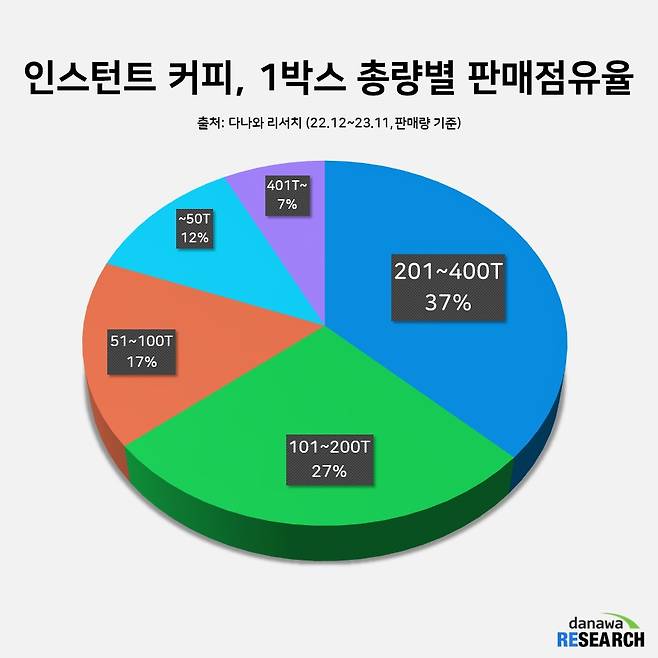 인스턴트 커피는 유통기한이 1~2년 정도로 길고 사무실에서 대량 구매하는 경우가 많은 만큼, 스틱이 100개 이상 포함된 대용량 제품이 인기를 끌고 있다. 2022년 12월부터 2023년 11월까지 판매량을 살펴보면, 201~400 스틱이 들어간 제품이 37% 점유율로 가장 인기가 많았고 2위 역시 101~200 스틱 제품이 차지했다. 뒤이어 일반 가정에서 두루 사용하기 좋은 51~100 스틱 제품이 3위에 올랐으며, ~50 스틱이 4위에 올라 스틱 수가 많을수록 선호도가 높다는 사실을 증명했다. 한편 401 스틱 이상 제품도 결코 낮지 않은 7% 점유율을 차지했다.