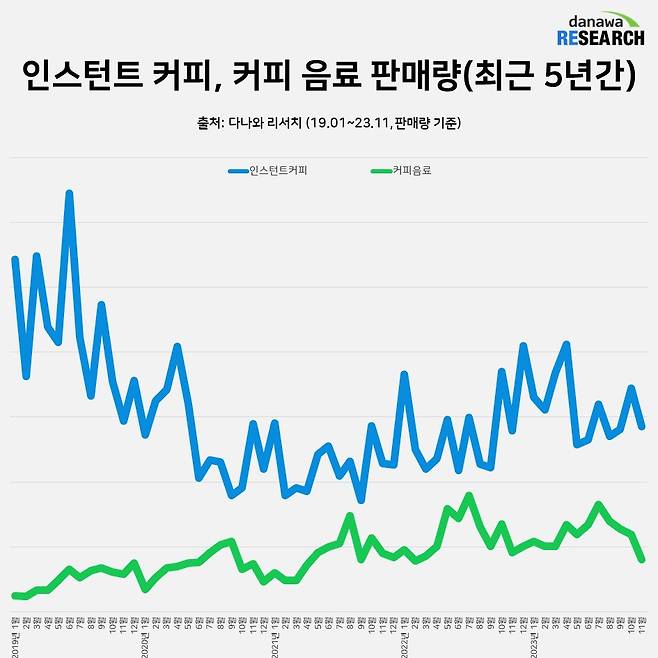 코로나19가 터지고 사무실에 출근하는 사람들이 급감하면서 2020년 1월 인스턴트 커피 판매량은 2019년 1월 대비 절반 정도로 뚝 떨어졌으나, 2023년 10월에는 코로나19가 터지기 이전인 2019년 10월과 비슷한 수준의 판매량을 회복했다. 한편 인스턴트 커피에 이어 판매량 2위에 오른 커피음료는 편의점 등에서 판매하는 커피 제품으로, 코로나19 유행에도 큰 타격 없이 완만한 상승세를 보여준다.
